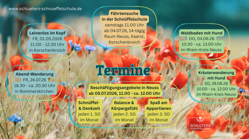 Ich begleite Mensch-Hund-Teams mit achtsamer Beschäftigung, bewusster Bewegung und entschleunigenden Erlebnissen, die Euch näher zusammenbringen und im Alltag stärken. In Schlüters Schnüffelschule findest Du keine klassischen Erziehungsangebote und auch kein Schneller-Höher-Weiter, sondern Beobachten, Verstehen und gemeinsames Wachsen – und das in Eurem individuellen Tempo und ohne Leistungsdruck.